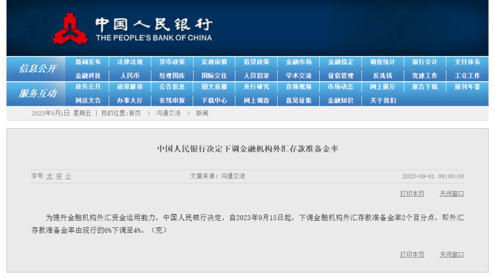 為提升金融機(jī)構(gòu)外匯資金運(yùn)用能力,中國(guó)人民銀行決定,自2023年9月15日起,下調(diào)金融機(jī)構(gòu)外匯存款準(zhǔn)備金率2個(gè)百分點(diǎn),即外匯存款準(zhǔn)備金率由現(xiàn)行的6%下調(diào)至4%。