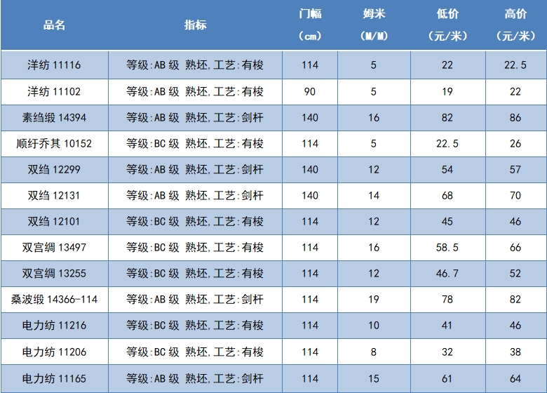 本周綢緞指數(shù)協(xié)作單位成交價格區(qū)間