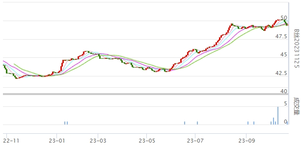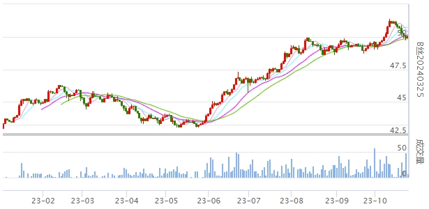 今日(2023年10月27日,周五)中國繭絲綢交易市場生絲指數(shù)上漲0.15%收于4932.28點,本周生絲指數(shù)下跌1.43%。B絲(商檢4A級生絲):231125合約上漲0.09萬元報收于49.50萬元;240325合約上漲0.12萬元報收于50.04萬元;240925合約上漲0.15萬元報收于48.24萬元。231125生絲合約日線