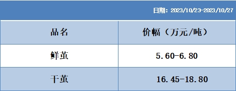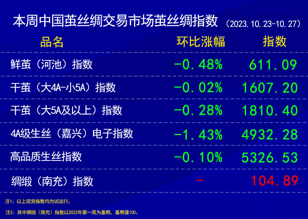 鮮繭價格指數(shù)上,由于收購成本高企,有部分協(xié)作單位本周暫停收購。本周采集點以廣西的第五批和第六批秋繭收購為主。根據(jù)收購地點,收購單位收購方式等,價格和質量上仍有差距,收購成本上也有些差距。整體上,鮮繭指數(shù)環(huán)比上周相差不大。