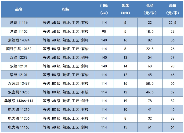 本周綢緞指數(shù)協(xié)作單位成交價(jià)格區(qū)間