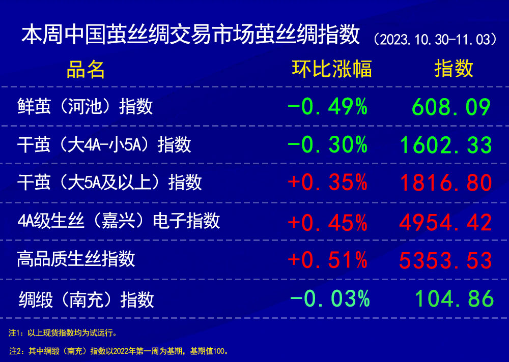 本周生絲電子指數(shù)累計(jì)上漲0.45%報(bào)收于4954.42點(diǎn)?,F(xiàn)貨月231125生絲合約貼近現(xiàn)貨實(shí)際,本周累計(jì)上漲0.73%。