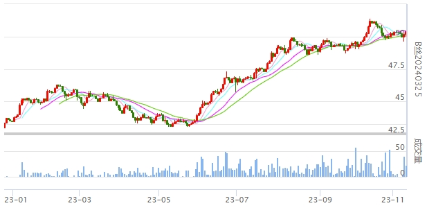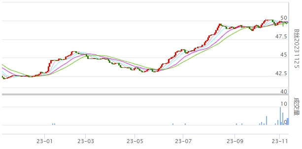 今日(2023年11月10日,周五)中國繭絲綢交易市場生絲指數(shù)上漲0.13%收于4948.31點,本周生絲指數(shù)下跌0.12%。B絲(商檢4A級生絲):231125合約下跌0.03萬元報收于49.74萬元;240325合約上漲0.18萬元報收于50.40萬元;240925合約上漲0.03萬元報收于48.45萬元。231125生絲合約日線