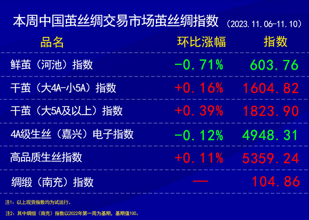 高品質(zhì)生絲指數(shù)上,根據(jù)協(xié)作單位所報,本周成交環(huán)比上周下降,成交中,價格差距較上周有所拉大。價格指數(shù)環(huán)比上周略收紅。