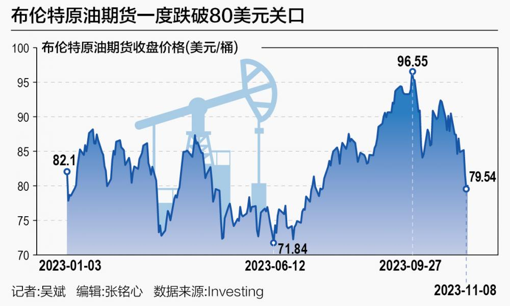 上周布倫特原油價(jià)格自7月以來首次跌破每桶80美元大關(guān)。11月10日,布倫特原油期貨徘徊在80美元/桶附近,WTI原油期貨在76美元/桶附近。