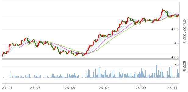 今日(2023年11月13日,周一)中國(guó)繭絲綢交易市場(chǎng)生絲指數(shù)下跌0.42%收于4927.66點(diǎn)。B絲(商檢4A級(jí)生絲):231125合約下跌0.15萬元報(bào)收于49.59萬元;240325合約下跌0.42萬元報(bào)收于49.98萬元;240925合約下跌0.24萬元報(bào)收于48.21萬元。