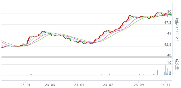 今日(2023年11月14日,周二)中國繭絲綢交易市場生絲指數微跌0.04%收于4925.75點。B絲(商檢4A級生絲):231125合約下跌0.03萬元報收于49.56萬元;240325合約上漲0.03萬元報收于50.01萬元;240925合約下跌0.06萬元報收于48.15萬元。
