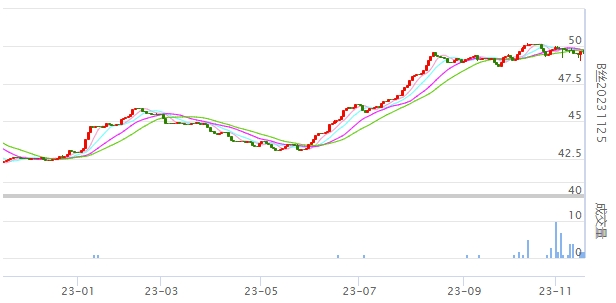 今日(2023年11月17日,周五)中國(guó)繭絲綢交易市場(chǎng)生絲指數(shù)上漲0.47%收于4956.19點(diǎn),本周生絲指數(shù)上漲0.16%。B絲(商檢4A級(jí)生絲):231125合約報(bào)平收于49.68萬(wàn)元;240325合約上漲0.45萬(wàn)元報(bào)收于50.49萬(wàn)元;240925合吧約上漲0.42萬(wàn)元報(bào)收于48.81萬(wàn)元。今日盤面A絲價(jià)格繼續(xù)上漲。231125生絲合約日線