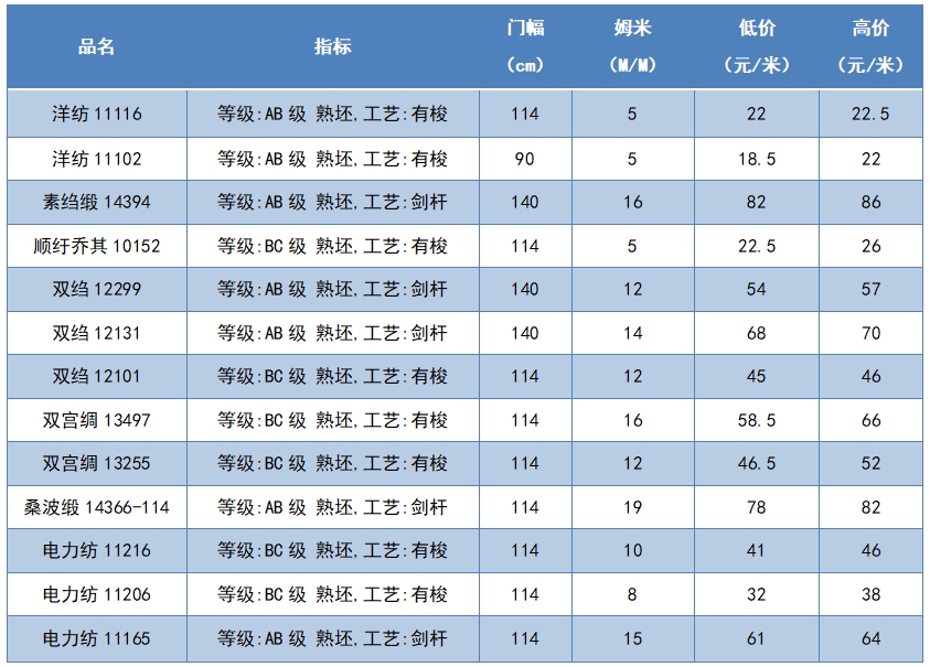 本周綢緞指數(shù)協(xié)作單位成交價(jià)格區(qū)間