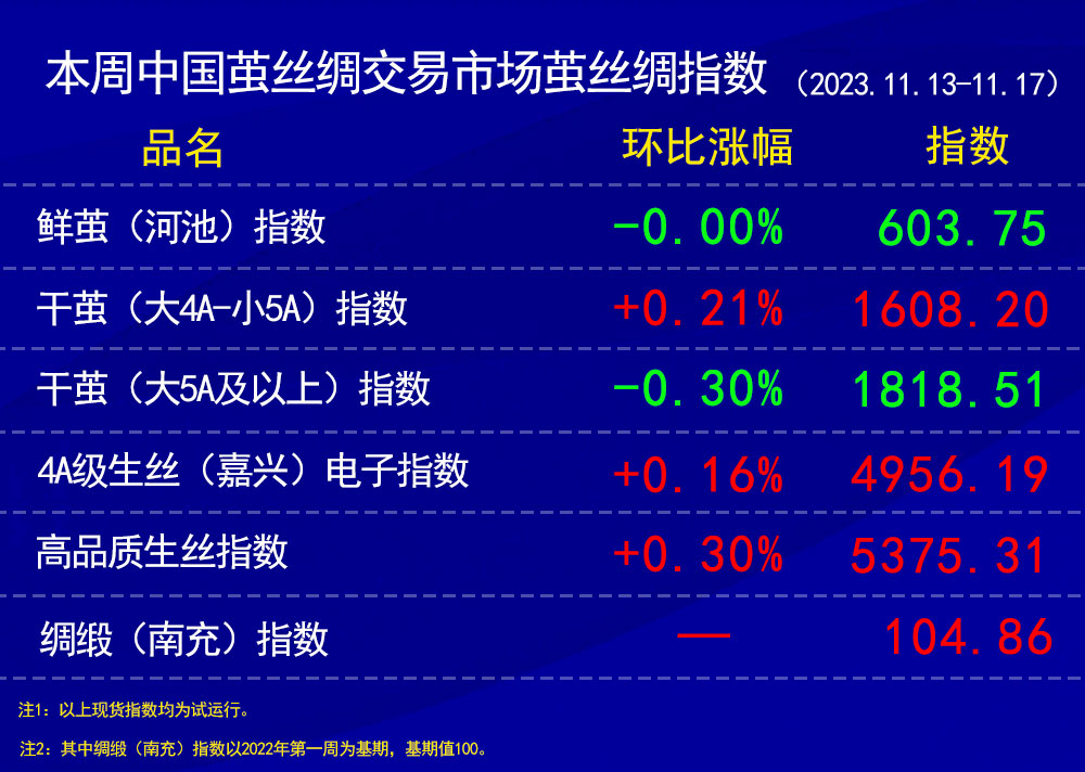 鮮繭指數(shù)上,全國(guó)蠶繭上市進(jìn)入尾期,在多數(shù)協(xié)作單位多停止收購(gòu)鮮繭下,本周所報(bào)筆數(shù)減少,整體鮮繭指數(shù)環(huán)比收平,價(jià)格波動(dòng)不大。