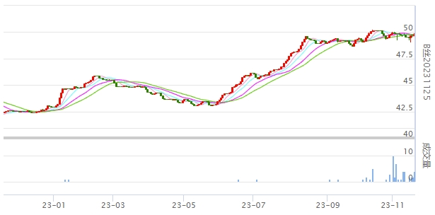 今日(2023年11月20日,周一)中國繭絲綢交易市場生絲指數上漲0.46%收于4979.21點。B絲(商檢4A級生絲):231125合約上漲0.06萬元報收于49.74萬元;240325合約上漲0.48萬元報收于50.97萬元;240925合約上漲0.24萬元報收于49.05萬元。今日盤面A絲價格繼續(xù)上漲。