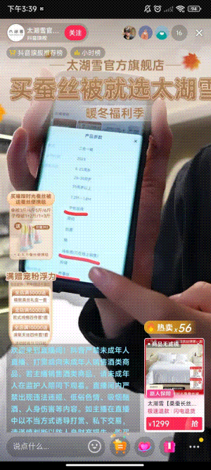 隨著信息技術和物流的發(fā)展,電商已經成為了一種重要的銷售途徑,其中直播帶貨也已成為了時下最為時髦的一種銷售方式。10月后,是絲綿被的慣例銷售旺季。近日來,在抖音平臺上包括太湖雪、羅萊、水星等在內的多家絲綿被廠家都在進行著直播帶貨,線下+線上(直播)的新模式在絲綢行業(yè)中的發(fā)展己經漸成主流。