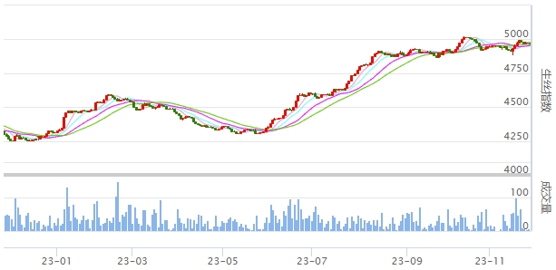 今日(2023年11月28日,周二)中國繭絲綢交易市場生絲指數(shù)微跌0.09%收于4968.27點(diǎn)。B絲(商檢4A級生絲):231225合約下跌0.06萬元報(bào)收于49.83萬元;240325合約報(bào)平收于50.67萬元;240925合約報(bào)平收于48.87萬元。今日代表高品質(zhì)生絲的A絲盤面部分合約有所小幅拉漲。