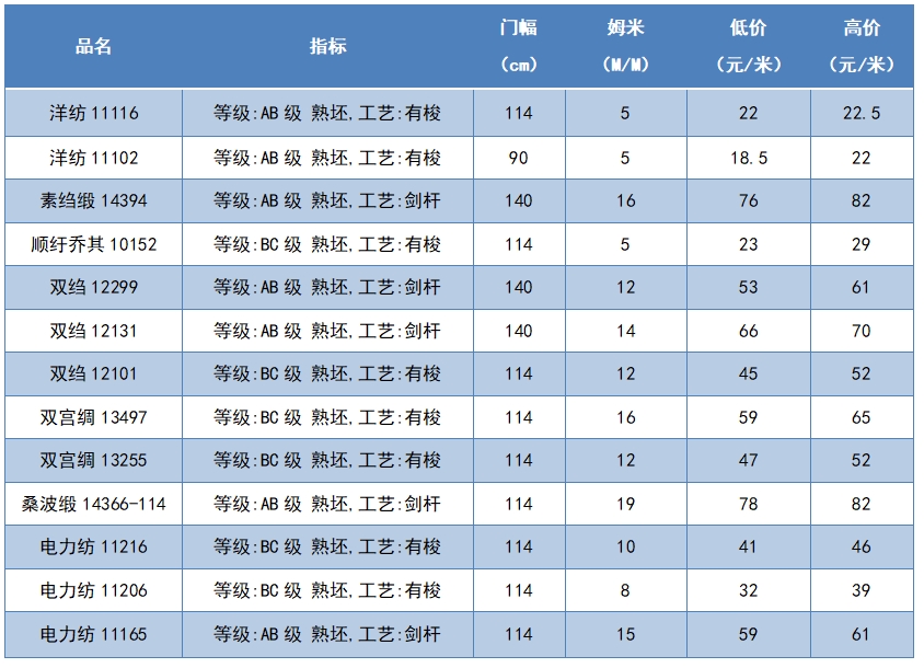 本周綢緞指數(shù)協(xié)作單位成交價(jià)格區(qū)間