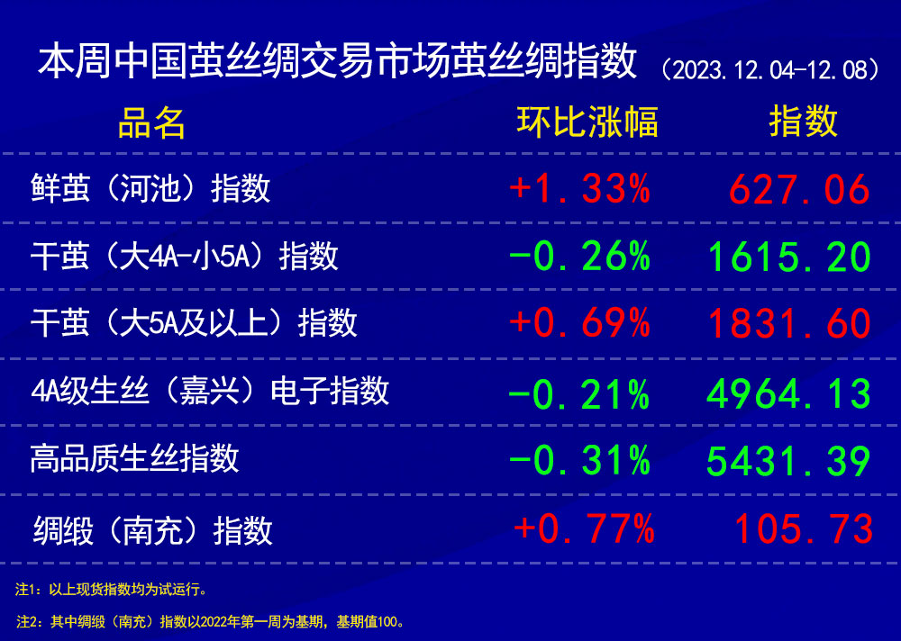 本周中國(guó)繭絲綢交易市場(chǎng)繭絲綢指數(shù)