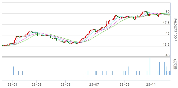 今日(2023年12月11日,周一)中國(guó)繭絲綢交易市場(chǎng)生絲指數(shù)微漲0.15%收于4971.69點(diǎn)。B絲(商檢4A級(jí)生絲):231225合約下跌0.03萬(wàn)元報(bào)收于49.65萬(wàn)元;240325合約上漲0.03萬(wàn)元報(bào)收于50.58萬(wàn)元;240925合約上漲0.06萬(wàn)元報(bào)收于49.17萬(wàn)元。