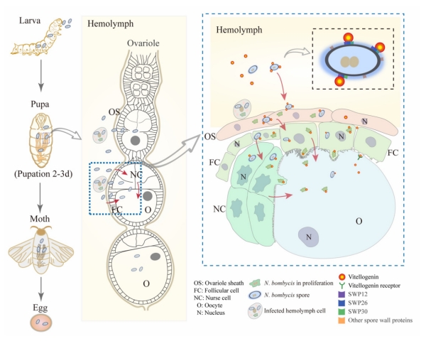 長久以來,養(yǎng)蠶業(yè)一直受到微粒子病的嚴(yán)重危害。早在750多年前,我國現(xiàn)存最早的官修農(nóng)書《農(nóng)桑輯要》就記載了家蠶微粒病問題,提出淘汰病蛾、選留完好蠶種的防治辦法。19世紀(jì),家蠶微粒子病在法國大流行,嚴(yán)重損害了法國蠶業(yè)發(fā)展。1865至1869年,“微生物學(xué)之父”路易·巴斯德(Louis Pasteur)受當(dāng)時政府指派,前往法國南部解決微粒子病難題,建立了母蛾鏡檢法防治該病,此法仍沿用至今。家蠶微粒子病之所以難以防治,其根本原因是該病的病原——家蠶微粒子蟲(Nosema bombycis)能夠侵染宿主(家蠶、棉鈴蟲和斜紋夜蛾等鱗翅目昆蟲)的卵母細胞,導(dǎo)致子代卵先天帶毒(故有“蠶的艾滋病”之稱)。因此,家蠶微粒子蟲成為蠶種生產(chǎn)過程中的唯一法定檢疫對象。然而,該病原是如何侵入家蠶卵母細胞的呢?這是蠶業(yè)科學(xué)領(lǐng)域的一個百年科學(xué)命題。