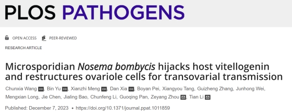 近日,資源昆蟲高效養(yǎng)殖與利用全國重點實驗室李田研究員課題組在微生物學(xué)Top期刊PLoS Pathogens在線發(fā)表了題為“Microsporidian Nosema bombycis hijacks host vitellogenin and restructures ovariole cells for transovarial transmission”的研究論文,揭示了家蠶微粒子蟲侵入家蠶卵母細胞的時間、路徑、形態(tài)、策略和關(guān)鍵分子機制。