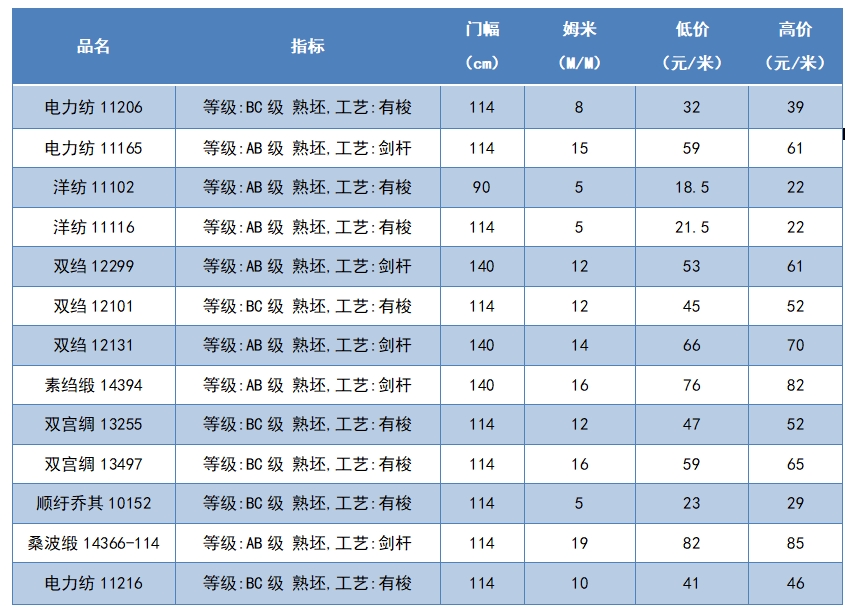 本周綢緞指數(shù)協(xié)作單位成交價(jià)格區(qū)間
