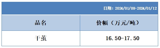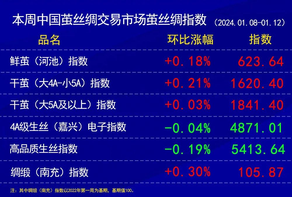 蠶繭指數(shù)上,根據(jù)協(xié)作單位所報(bào)。干繭貿(mào)易量不多,工廠有在春節(jié)前繼續(xù)備原料。本周兩個(gè)等級的干繭指數(shù)環(huán)比略上漲。