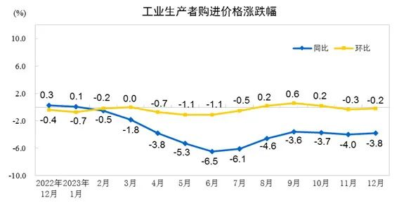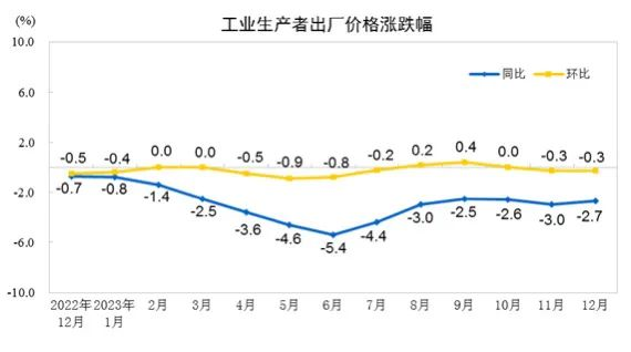 2023年12月份,全國工業(yè)生產(chǎn)者出廠價(jià)格同比下降2.7%,環(huán)比下降0.3%;工業(yè)生產(chǎn)者購進(jìn)價(jià)格同比下降3.8%,環(huán)比下降0.2%。2023年全年,工業(yè)生產(chǎn)者出廠價(jià)格比上年下降3.0%,工業(yè)生產(chǎn)者購進(jìn)價(jià)格下降3.6%。