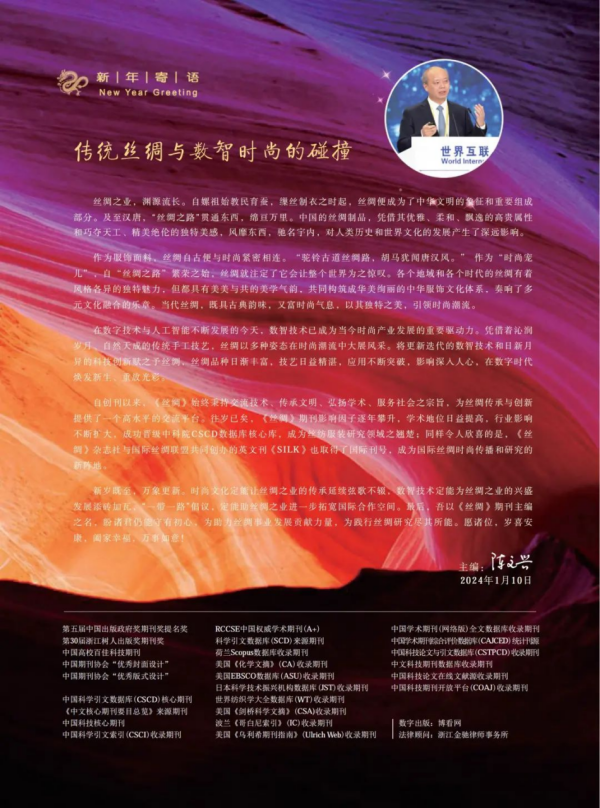 新歲既至,萬(wàn)象更新。時(shí)尚文化定能讓絲綢之業(yè)的傳承延續(xù)弦歌不輟,數(shù)智技術(shù)定能為絲綢之業(yè)的興盛發(fā)展添磚加瓦,“一帶一路”倡議,定能助絲綢之業(yè)進(jìn)一步拓寬國(guó)際合作空間。最后,吾以《絲綢》期刊主編之名,盼諸君仍能守有初心,為助力絲綢事業(yè)發(fā)展貢獻(xiàn)力量,為踐行絲綢研究盡其所能。愿諸位,歲喜安康,闔家幸福,萬(wàn)事如意!