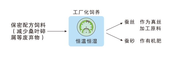 工廠化養(yǎng)蠶是以現(xiàn)代農(nóng)業(yè)科技理念,創(chuàng)建了高效率、低成本、一體化的現(xiàn)代繭絲生產(chǎn)新技術(shù)體系,系統(tǒng)集成品種、飼料、生產(chǎn)工藝、防病體系、環(huán)境控制、人工智能等多項創(chuàng)新技術(shù)打破傳統(tǒng)養(yǎng)蠶季節(jié)性,實現(xiàn)365天,天天可養(yǎng)蠶,天天可收繭。和傳統(tǒng)養(yǎng)蠶相比,企業(yè)采用豆腐渣、玉米粉、桑粉、復(fù)合維生素等,通過特殊配比制成的保密配方飼料替代桑葉,生產(chǎn)車間代替養(yǎng)蠶室,以自動化養(yǎng)蠶裝備代替蠶具,基本消除了傳統(tǒng)養(yǎng)蠶過程桑葉碎屑、破舊蠶匾、蠶架等廢棄物,同時通過飼料配比的調(diào)整,有效減少蠶砂中的雜質(zhì),提升蠶砂可利用水平。