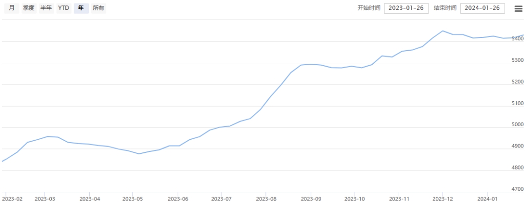 今日(2024年01月26日,周五)中國繭絲綢交易市場生絲指數(shù)上漲0.67%報(bào)4999.19點(diǎn),本周生絲指數(shù)上漲1.25%。B絲(商檢4A級生絲):240325合約上漲0.36萬元報(bào)收于50.58萬元;240925合約上漲0.39萬元報(bào)收于49.26萬元;250325合約上漲0.45萬元報(bào)收于49.26萬元。