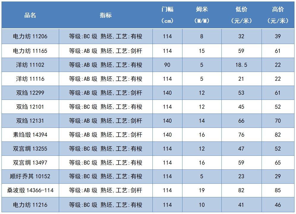 本周綢緞指數(shù)協(xié)作單位成交價(jià)格區(qū)間