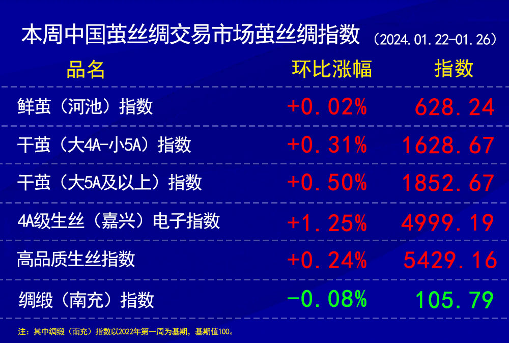 鮮繭指數(shù)上,根據(jù)協(xié)作單位所報(bào),主要由于生絲價(jià)格部分有上漲,整體帶動(dòng)倒推出的鮮繭價(jià)格指數(shù)本周略收紅上漲。
