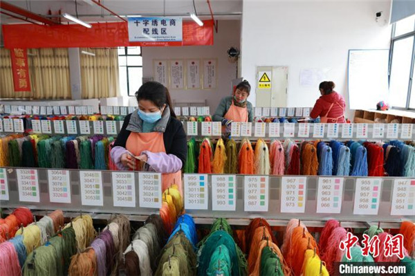 1月25日,一名工人在生產(chǎn)十字繡產(chǎn)品