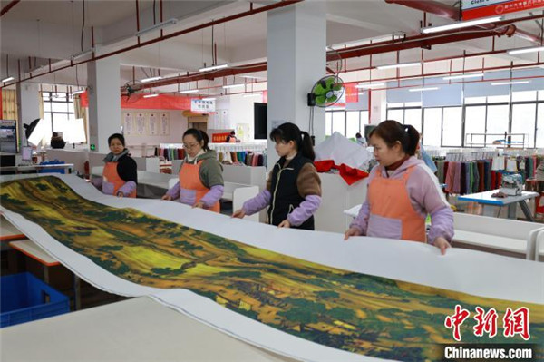 圖為工人展示一幅33米長(zhǎng)的《清明上河圖》十字繡樣圖