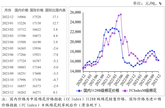 (一)國內(nèi)棉價繼續(xù)下跌。本月,紡織企業(yè)新增訂單數(shù)量有限,開機率下降,棉花采購意愿不強,價格繼續(xù)下跌。據(jù)《中國棉花工業(yè)庫存調(diào)查報告》,截至12月初,被調(diào)查企業(yè)開機率為81.1%,環(huán)比下降2.3個百分點;準(zhǔn)備采購棉花的企業(yè)占40.6%,環(huán)比減6.5個百分點,同比減17.2個百分點,比近五年同期平均水平減少18.7個百分點。據(jù)國家棉花市場監(jiān)測系統(tǒng)數(shù)據(jù),截至12月21日,全國皮棉銷售率為13.2%,同比下降2.2個百分點,較過去四年均值下降10.6個百分點。12月份,國內(nèi)3128B級棉花月均價每噸16262元,環(huán)比跌3.5%,同比漲8.7%。鄭棉期貨主力合約(CF405)月結(jié)算價每噸15450元,環(huán)比漲3.3%,同比漲12.1%。