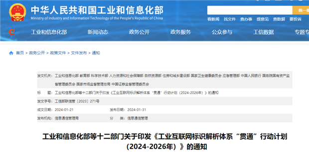 為進(jìn)一步凝聚產(chǎn)業(yè)共識(shí)、強(qiáng)化政策引導(dǎo),推動(dòng)標(biāo)識(shí)解析體系由“建”到“用”,拓展在工業(yè)領(lǐng)域的應(yīng)用廣度和深度,促進(jìn)標(biāo)識(shí)解析體系向經(jīng)濟(jì)社會(huì)各領(lǐng)域廣泛推廣,同步提升設(shè)施、技術(shù)、標(biāo)準(zhǔn)、數(shù)據(jù)、人才等要素支撐能力,加快實(shí)現(xiàn)應(yīng)用可控和生態(tài)可控,支撐制造強(qiáng)國(guó)、網(wǎng)絡(luò)強(qiáng)國(guó)、數(shù)字中國(guó)建設(shè),工業(yè)和信息化部等十二部門(mén)聯(lián)合印發(fā)《行動(dòng)計(jì)劃》。