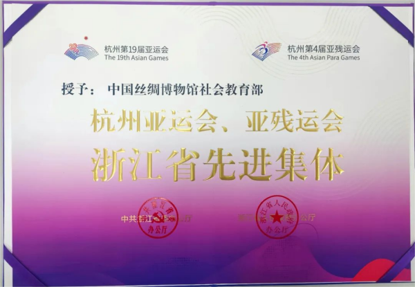 中國(guó)絲綢博物館積極參與杭州第19屆亞運(yùn)會(huì)語(yǔ)言服務(wù)業(yè)務(wù)領(lǐng)域及禮賓接待業(yè)務(wù)領(lǐng)域,組織多個(gè)展覽,接待多批重要觀眾,在協(xié)助競(jìng)賽場(chǎng)館組建語(yǔ)言服務(wù)團(tuán)隊(duì)、保障賽后新聞發(fā)布會(huì)翻譯工作、展現(xiàn)城市風(fēng)貌等各環(huán)節(jié)全程參與,助力亞運(yùn)會(huì)亞殘運(yùn)會(huì)順利圓滿舉行,中國(guó)絲綢博物館社會(huì)教育部榮獲杭州亞運(yùn)會(huì)、亞殘運(yùn)會(huì)浙江省先進(jìn)集體榮譽(yù)。