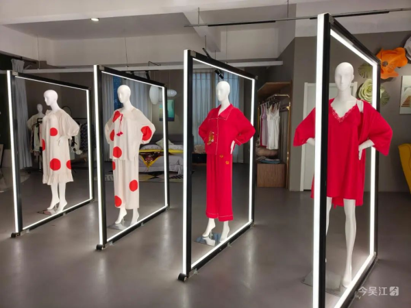 “這是我們最近到法國、意大利參展的一套真絲睡衣,白色的底子上印滿了中國麻將牌的圖案,深受外國客戶的喜愛。龍年到了,我們推出了紅色家居服,上面印上卡通小龍,既喜慶又活潑,在抖音直播間一上架銷售十分火爆?!蓖醮夯ㄕJ(rèn)為,產(chǎn)品是企業(yè)的生命線,在注重產(chǎn)品品質(zhì)的同時(shí),花形、顏色、款式等方面也要不斷推陳出新,“我們每個季度設(shè)計(jì)的款式達(dá)60個左右,2023年我們正式推出的新產(chǎn)品有120多款,把傳統(tǒng)的原料打造成時(shí)尚的服飾,才能打動更多的消費(fèi)者?!蓖醮夯ㄕf。