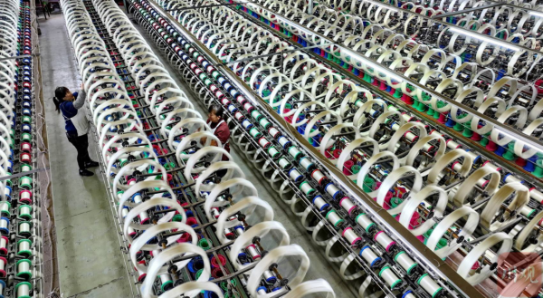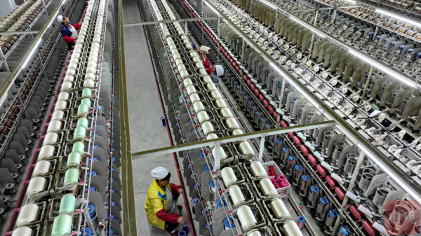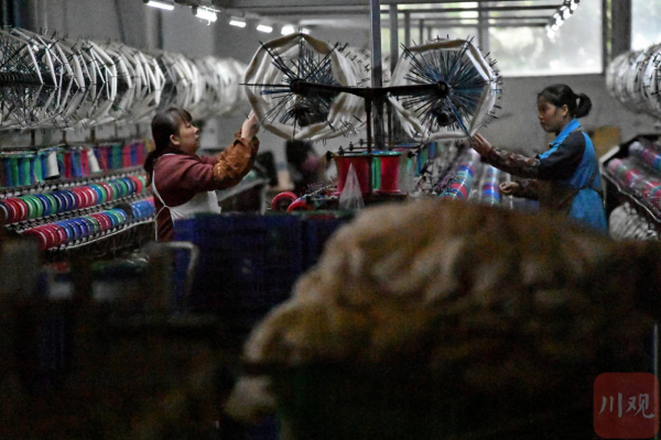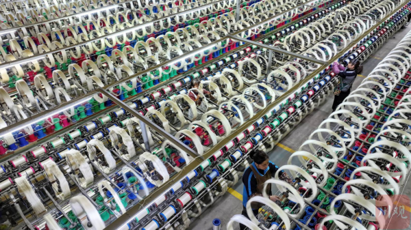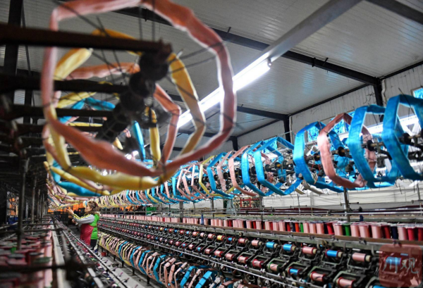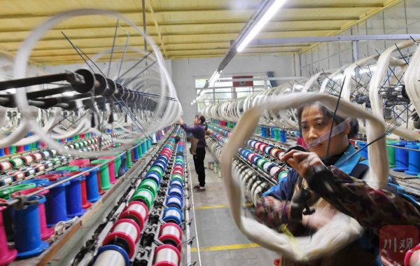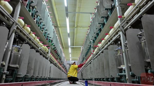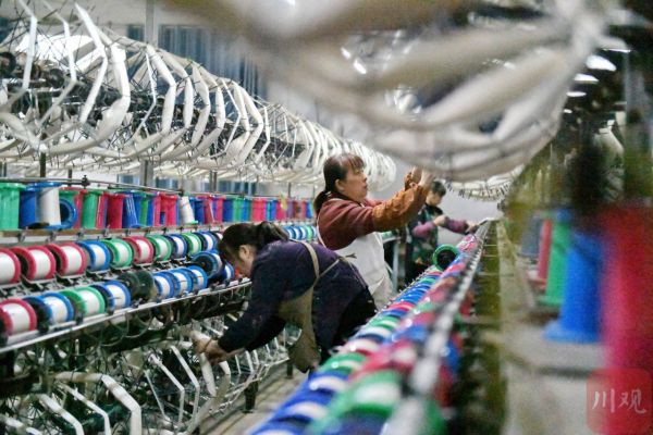 2月21日,在位于四川省南充市嘉陵工業(yè)集中區(qū)的四川順成紡織有限公司紡織車間,工人正在進行并攆絲