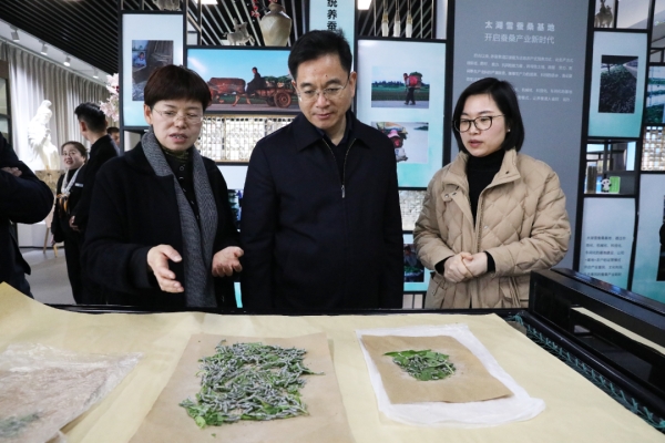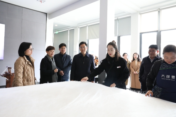 在太湖雪蠶桑文化園,許益軍一行參觀了科普長廊、育蠶課堂、繭藝工坊等,聽取震澤鎮(zhèn)源遠(yuǎn)流長的蠶桑絲綢文化介紹,實地感受剝繭抽絲、拉綿制被等傳統(tǒng)工藝。太湖雪蠶桑文化園是中國首個以蠶桑為主題,集農(nóng)業(yè)示范、蠶??蒲?、文化休閑、科普展示、生態(tài)旅游為一體的特色生態(tài)園,通過4000平方米展示館、2000畝桑園、2000畝果園、2000畝稻田再現(xiàn)江南魚米之鄉(xiāng)、絲綢之府。