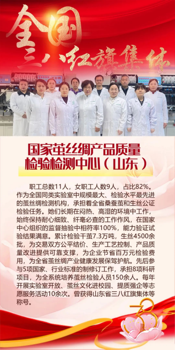 3月3日,全國婦聯(lián)在京舉行紀(jì)念“三八”國際婦女節(jié)暨表彰大會(huì)。大會(huì)表彰了10名全國三八紅旗手標(biāo)兵、300名全國三八紅旗手、200個(gè)全國三八紅旗集體。山東10名個(gè)人和7個(gè)集體獲表彰,其中,省纖維質(zhì)量監(jiān)測(cè)中心所屬的國家繭絲綢產(chǎn)品質(zhì)量檢驗(yàn)檢測(cè)中心(山東)榮獲全國三八紅旗集體稱號(hào)。