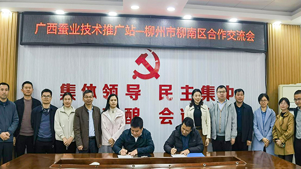 調(diào)研組先后到柳州市柳南區(qū)流山鎮(zhèn)實地考察蠶桑生產(chǎn)情況,到柳州市綠都現(xiàn)代農(nóng)業(yè)示范園調(diào)研設(shè)施蔬菜生產(chǎn)情況。在柳南區(qū)流山鎮(zhèn)調(diào)研期間,調(diào)研組通過實地考察、走訪座談等形式,深入了解當(dāng)前桑園標(biāo)準(zhǔn)化種植管理、小蠶共育、省力化設(shè)施大蠶房建設(shè)、繅絲廠以及蠶桑三產(chǎn)融合示范基地等全產(chǎn)業(yè)鏈生產(chǎn)情況。在與柳南區(qū)開展科技合作交流會上,雙方就創(chuàng)建柳州市柳南區(qū)稻海桑田桑蠶產(chǎn)業(yè)示范區(qū)開展技術(shù)領(lǐng)域合作與指導(dǎo)服務(wù)達(dá)成意見,并簽訂《蠶桑產(chǎn)業(yè)科技合作協(xié)議》。