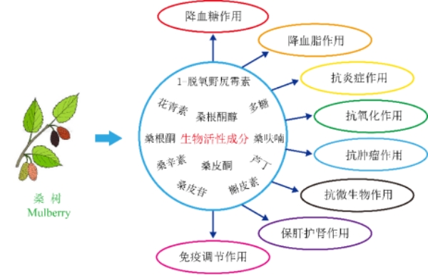 桑樹不僅是養(yǎng)蠶業(yè)的飼料來源,也是一種重要的藥用植物。桑樹的多個部位均可加工為中藥制劑來預(yù)防或治療多種疾病?,F(xiàn)代藥理學(xué)研究表明,桑樹的枝(桑枝)、葉(桑葉)、根皮(桑白皮)、果穗(桑葚)中富含生物堿類、黃酮類、苯并呋喃類、多糖類等化學(xué)成分,這些物質(zhì)具有降血糖、降血脂、抗炎、抗腫瘤、肝臟保護(hù)以及免疫調(diào)節(jié)等多種藥理活性。