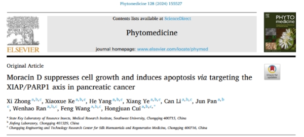 近日,西南大學(xué)資源昆蟲高效養(yǎng)殖與利用全國重點(diǎn)實(shí)驗(yàn)室崔紅娟教授在中科院醫(yī)學(xué)一區(qū)TOP期刊Phytomedicine(植物藥學(xué),IF=7.9)在線發(fā)表題為“Moracin D suppresses cell growth and induces apoptosis via targeting the XIAP/PARP1 axis in pancreatic cancer”的最新研究成果,該研究發(fā)現(xiàn)了一種新的具有抗腫瘤活性的桑樹活性成分桑辛素D(Moracin D)在抑制胰腺癌發(fā)展進(jìn)程中的作用并解析了其在抗胰腺癌中的分子作用機(jī)制。