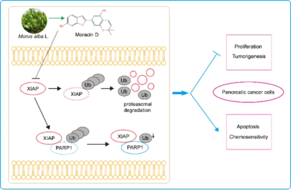 在該研究中,研究人員首先通過網(wǎng)絡(luò)藥理學(xué)數(shù)據(jù)庫分析發(fā)現(xiàn)桑樹中的苯并呋喃類化合物桑辛素D是一種潛在的抗癌活性物質(zhì)并與癌癥通路密切相關(guān)。隨后通過組學(xué)分析、細(xì)胞生物學(xué)和分子生物學(xué)等實(shí)驗(yàn),揭示桑辛素D顯著抑制胰腺癌細(xì)胞的生長并促進(jìn)胰腺癌細(xì)胞凋亡。進(jìn)一步研究顯示,桑辛素D通過增加胰腺癌細(xì)胞中凋亡抑制蛋白XIAP的泛素化降解來下調(diào)XIAP的蛋白表達(dá),從而減弱其下游的多聚ADP核糖聚合酶PARP1的蛋白穩(wěn)定性,表明桑辛素D可以通過靶向XIAP/PARP1軸來抑制胰腺癌細(xì)胞的發(fā)展進(jìn)程。此外,通過聯(lián)合用藥分析表明,桑辛素D與胰腺癌的臨床一線化療藥物吉西他濱聯(lián)合后顯著增強(qiáng)了胰腺癌細(xì)胞的化療敏感性,揭示了其潛在的臨床應(yīng)用前景。