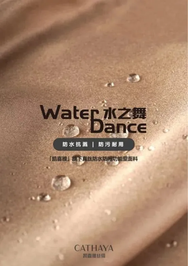 此外,凱喜雅此次展會還推出了“水之舞”防水防油防污功能性絲綢面料。蔣璐介紹,“水之舞”真絲功能性面料采用新型科技,在絲綢表面形成亞微觀級粗糙凸起,構(gòu)建出了像荷葉表面的超疏水表面保護膜。生活中常見的水、咖啡、茶醬油、飲料等液體不會浸透面料,而是在面料表面形成液滴,一抖即落,改善了傳統(tǒng)真絲面料容易臟、難打理、受季節(jié)限制等缺點,讓絲綢使用更廣泛、更耐用。蔣璐還現(xiàn)場試驗,讓自己親身感受了“水之舞”的功能。