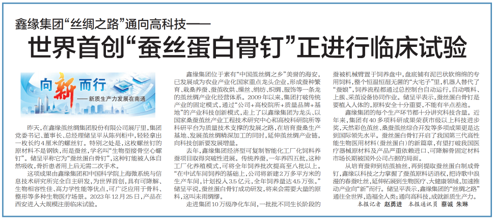從培育蠶卵到結(jié)繭抽絲,再到提取蠶絲蛋白制成骨釘,鑫緣以科技之力掌握了蠶繭原料話語(yǔ)權(quán),把詩(shī)歌中浪漫的春蠶吐絲,延伸拓展到生物醫(yī)療、大健康領(lǐng)域,加速推動(dòng)產(chǎn)業(yè)向“新”而行。儲(chǔ)呈平表示,鑫緣集團(tuán)的“絲綢之路”通往全世界,造福全人類(lèi);通向高科技,成就新質(zhì)生產(chǎn)力。