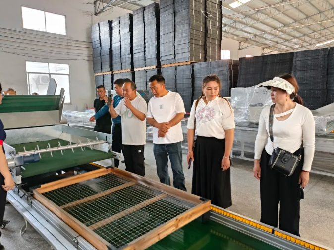 最后,在黃副總陪同下,考察團還參觀了養(yǎng)蠶生產(chǎn)線的工作原理,這套養(yǎng)蠶生產(chǎn)線主要由控制箱、進框口、出框口、蠶框輸送帶、喂葉機、撒石灰機、均葉機等組成,3分鐘就可以實現(xiàn)12層蠶框自動堆疊、自動撒石灰消毒、自動喂葉、分框提青,較地面養(yǎng)蠶面積節(jié)省5倍,智能化控制,流水線喂養(yǎng),方便快捷。同時,考察團還詳細了解了分體式小蠶飼育機、高速切葉機的工作原理,表示要把這些省力化蠶具設(shè)備的情況匯總,回到他們當?shù)剡M行宣傳和推廣,林勝堂自研的省力化設(shè)備確實能夠幫助蠶農(nóng)提量增產(chǎn),降低人工成本,值得推廣和學習。
