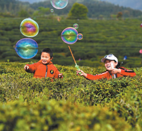 清明時節(jié),游客在江西省宜春市銅鼓縣鳳山村生態(tài)茶園踏青游玩