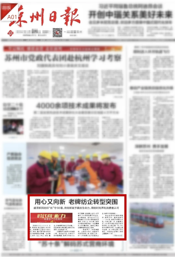 近日,《蘇州日報》關(guān)注盛澤,頭版刊文《用心又向新 老牌紡企轉(zhuǎn)型突圍 盛澤新民紡織“絲”守66載,用創(chuàng)新賦予真絲生命力,得到時尚界和消費者認(rèn)可》。