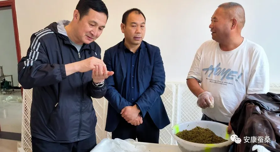 在全面查看和了解大營盤蠶桑專業(yè)合作社的桑園狀況、管理情況和蠶室設(shè)施條件及2023年生產(chǎn)情況后,陳康鼓勵合作社要抓住目前繭絲市場行情有利時機和擁有500畝優(yōu)良品種桑園基礎(chǔ)及良好的交通、勞力等生產(chǎn)要素,加強養(yǎng)蠶設(shè)施建設(shè),管好用好現(xiàn)有桑樹資源,多產(chǎn)葉、多養(yǎng)蠶、多產(chǎn)繭、多延鏈,助力蠶農(nóng)增收、產(chǎn)業(yè)增效。一要優(yōu)化大蠶飼養(yǎng)方式,將養(yǎng)地蠶轉(zhuǎn)變?yōu)樾Q臺育,充分利用蠶室空間和桑葉資源,擴大養(yǎng)蠶規(guī)模,在同一蠶室內(nèi),蠶臺育比地面育可提高養(yǎng)蠶量1.5倍以上,同時每批次能夠縮短齡期3天左右。二要優(yōu)化養(yǎng)蠶組織方式,合作社重點抓好小蠶共育和示范引導(dǎo),合理確定自營養(yǎng)蠶規(guī)模,通過榜樣效益示范吸引當(dāng)?shù)卮迕褚浴胺底獾拱狈绞骄徒邪@,然后專養(yǎng)大中蠶增加養(yǎng)蠶批次擴大生產(chǎn)規(guī)模,最終實現(xiàn)由“一枝獨秀”向“眾星拱月”集群發(fā)展,同時通過常態(tài)化養(yǎng)蠶將群眾牢牢吸附在產(chǎn)業(yè)發(fā)展中,變蠶桑產(chǎn)業(yè)由副業(yè)為主業(yè)。三要加大產(chǎn)業(yè)鏈式發(fā)展,縱向積極開發(fā)桑葉茶、蠶絲被等終端產(chǎn)品,延長產(chǎn)業(yè)鏈,橫向持續(xù)推進糧桑復(fù)合經(jīng)營、桑園套種羊肚菌等模式,提高經(jīng)濟效益,同時穩(wěn)步推進蠶桑研學(xué)、蠶桑文化展示等措施形成桑旅一體化、三產(chǎn)融合發(fā)展。