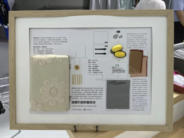 此外,展出的國(guó)賓夫人禮系列產(chǎn)品同樣令人矚目。以“柳浪聞鶯”真絲手包為例,其正面采用了手工刺繡與手工釘珠的傳統(tǒng)工藝,背面則應(yīng)用數(shù)字化AI人工智能織造技術(shù),實(shí)現(xiàn)每平方米5500萬(wàn)個(gè)獨(dú)立織點(diǎn),將過(guò)往只能用印刷實(shí)現(xiàn)的繁復(fù)圖案可以真正“織造出來(lái)”。
